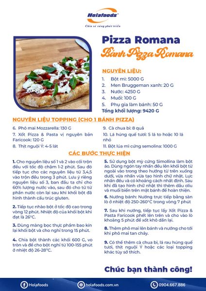 Pizza Romana nổi tiếng nhờ đế bánh mỏng – giòn cạnh – xốp nhẹ bên trong, nướng ở nhiệt độ cao giúp tạo lớp vỏ lấm tấm bọng khí đẹp mắt. Công thức dưới đây sử dụng xốt Pizza & Pasta Faricook và phô mai Mozzarella để tạo đúng hương vị Ý chuẩn: thanh – thơm – béo nhẹ – cực kỳ hài hòa.